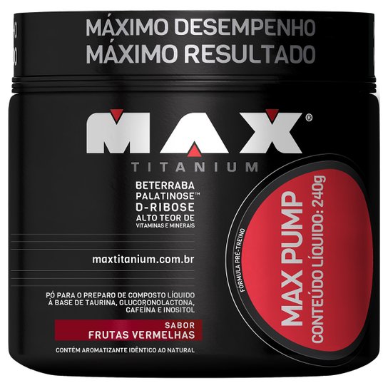 O Max Pump 240 g - Max Titanium contém um blend especial de ingredientes que inclui 3 tipos de carboidratos, beterraba, cafeína, taurina, glucoronolactona, vitaminas e minerais.